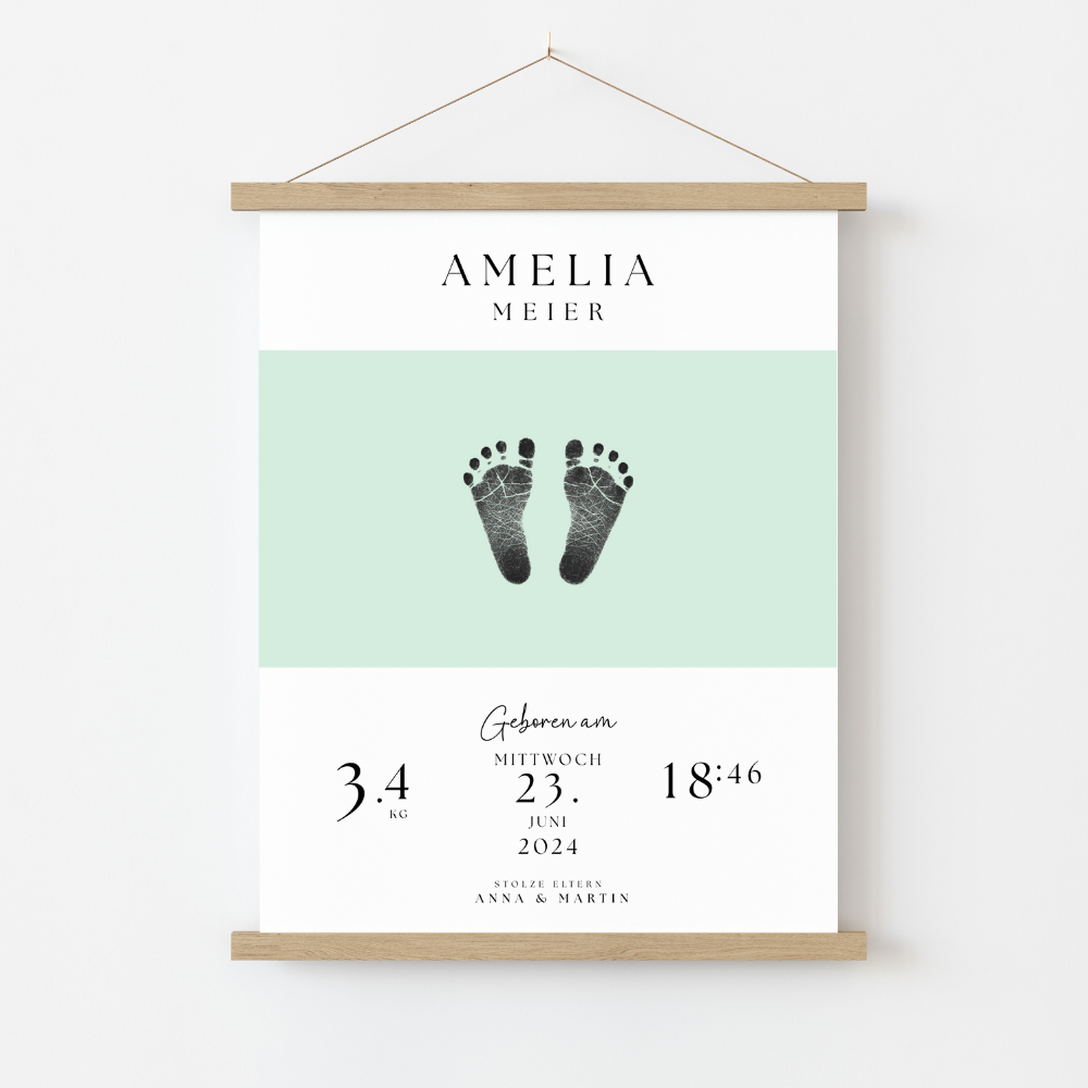- Poster mit Stempelset: Damit du den Fußabdruck deines Kindes ganz bequem selbst auf das Poster bringen kannst.